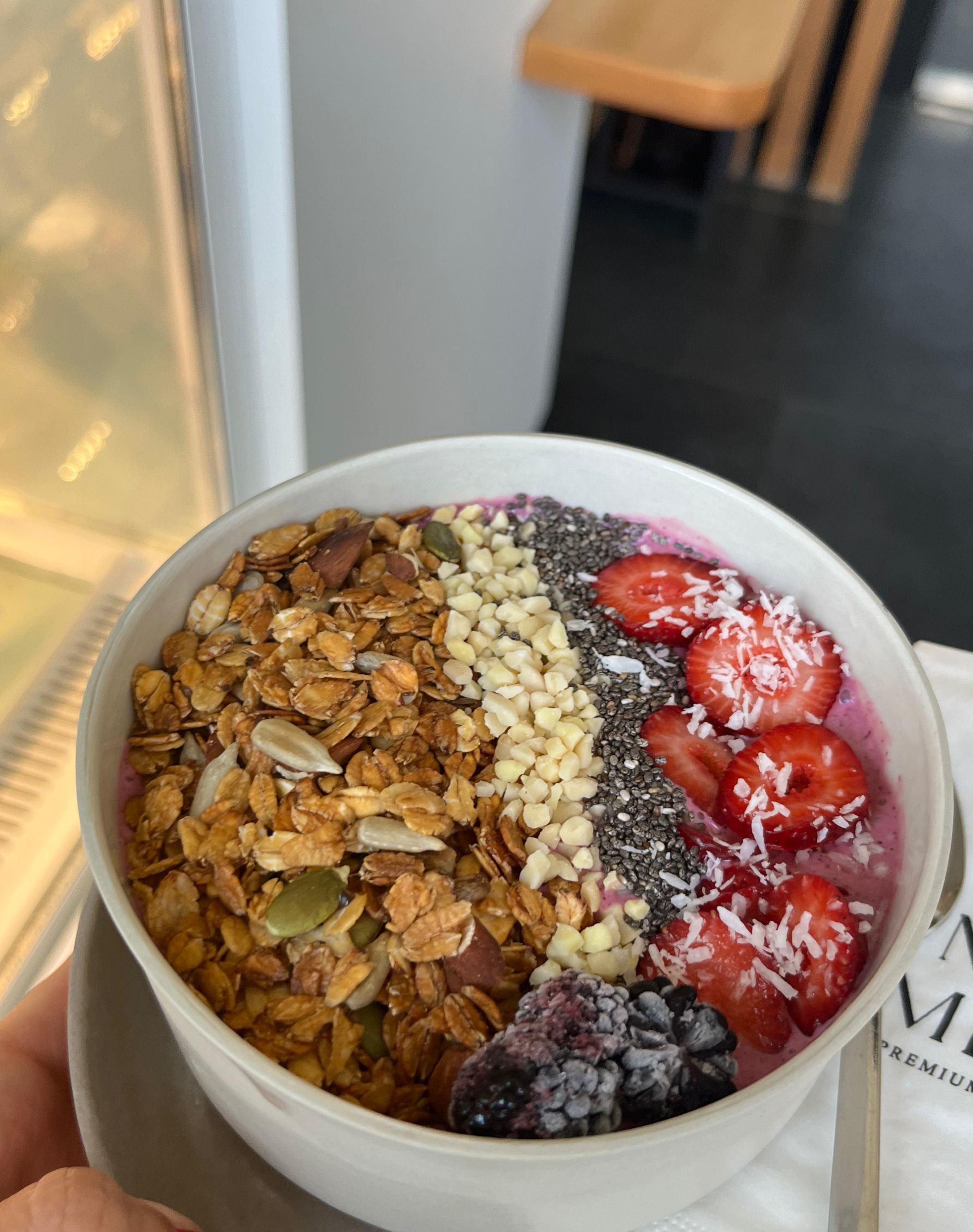 Orman meyveleri, muz, süzme yoğurt, bal, acai tozu, Hindistan cevizi, granola, çilek, chia tohumu